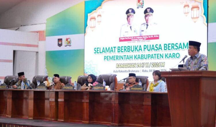 Kabanjahe, METRO EKSPRES |Bupati Karo ,Brigjen pol ( purn) Dr.dr.Ssntonius Ginting Sp.OG, M.kes ,menghadiri buka puasa bersama Pemerintah Kabupaten Karo pada bulan suci Ramadhan 1447 H/2026 yang dilaksanakan di aula Rakoetta Brahmana ,Kantor Bupati Karo,  Kabanjahe ,Rabu (4/3/2026) .